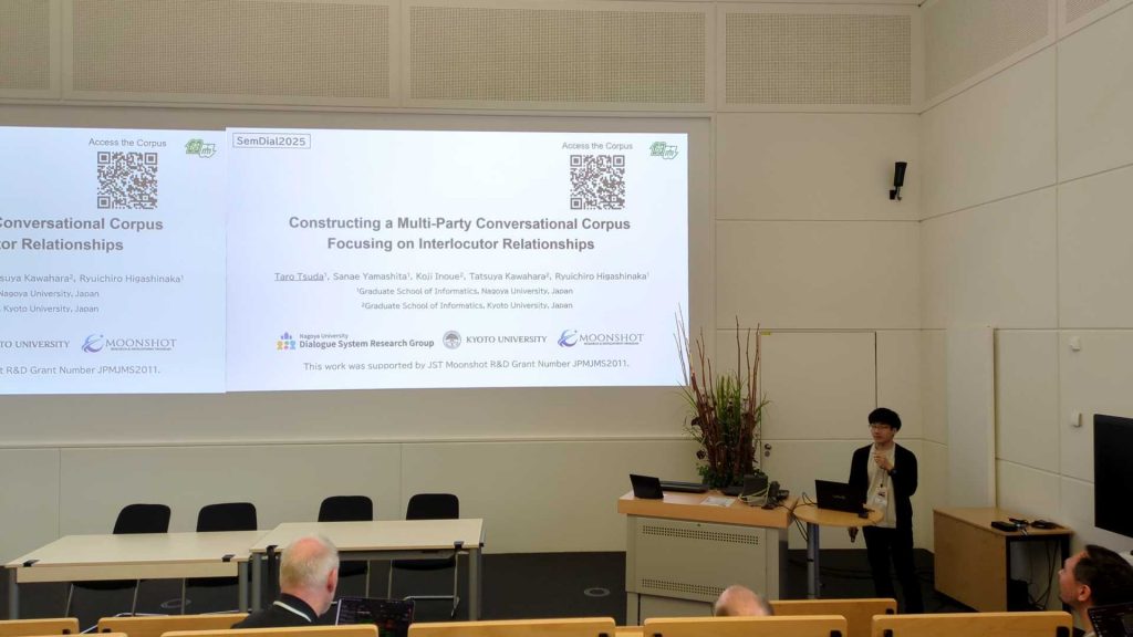 津田は,3日目のオーラルセッションにて,話者間の関係性に着目したマルチパーティ雑談対話コーパスの構築に関する研究発表を行いました.構築したコーパスを用いて,対話における関係性の表出度合いや,人間と大規模言語モデルの話者間の関係性の捉え方の違いについて分析し,その結果について説明しました.